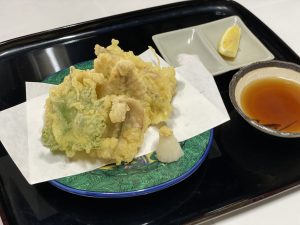 ニシンの天ぷら、山菜、なめこ、粒そば、ジュンサイ